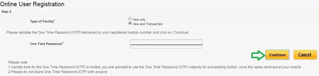 Step 3: You would also have to select the type of facility you want. You may choose a read-only access or you can opt for the view and transaction access as well. Now enter otp sent to your registered mobile number and click the ‘continue‘ button.