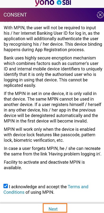 Step 5. Under CONSENT, accept the term and conditions of using Mpin. Then click on the “Next” button.