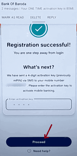 Step 8. Now, a confirmation message will display for successful registration on the next mobile screen. You will receive an SMS on your registered mobile number showing a 4-digit Activation key to activate mobile banking. Enter the Activation key as needed. Then click on the “Proceed” button.