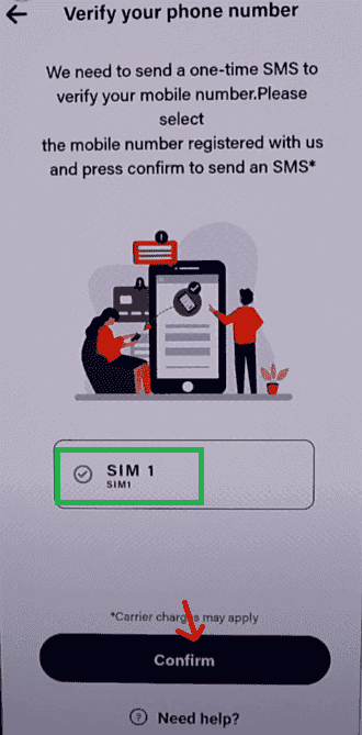 Step 3. Select SIM 1 or SIM 2 according to your registered mobile number on the next screen. Then click on the “Confirm” button. A flash SMS message will be displayed on your mobile screen next. Click on the “Cancel” button.