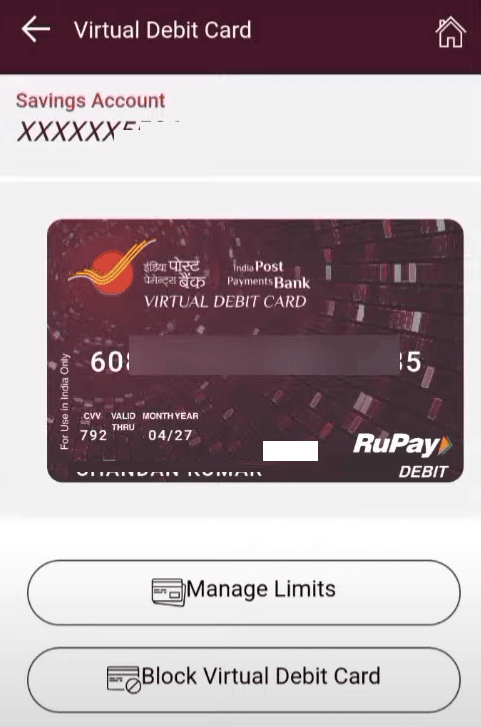 Step 8. Next, the image of your IPPB virtual/digital Debit card will be displayed on the next screen. Click on the “View Card Details” option under the image of your Debit card.